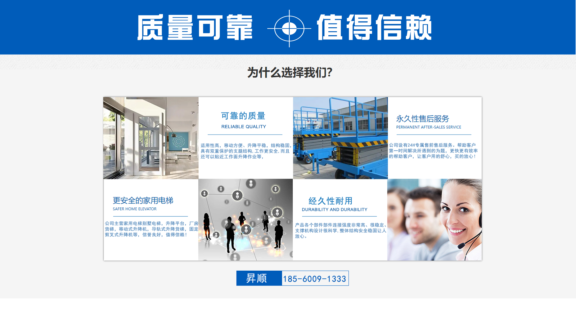 山東昇順液壓升降機械有限公司是一家主營家用電梯,別墅電梯,升降平臺,廠房貨梯,移動式升降機,導軌式升降貨梯,固定剪叉式升降機等產品企業,質量可靠,值得信賴?! ∮脩糁辽希杂脩魹橹行摹笔枪居肋h堅持的服務宗旨,贏得用戶的贊許是我們的榮譽,及時滿足用戶的需求,是我們公司的愿望。長期以來,公司員工以優質的服務,取悅于用戶,以誠信的言行取信于用戶,得到了用戶們的好評。我們期待著與您更加愉快的合作!公司的發展,離不開社會的大力支持,在社會的支持和幫助下,我們正昂首闊步邁向未來! 我們的經營方針是:以質量求生存,以產品求發展,以信譽保合作,以服務贏客戶。 本公司對產品質量和各項服務恪守合同承諾,并愿與新老客戶精誠合作,共創未來?! 」揪瘢簞撔率侵黝},超越是不懈的追求。 公司宗旨:信譽保證,誠信為本?! ∥覀儠院侠淼膬r格,良好的信譽,雄厚的實力,優質的產品,最周到的服務,服務于廣大新老客戶!...